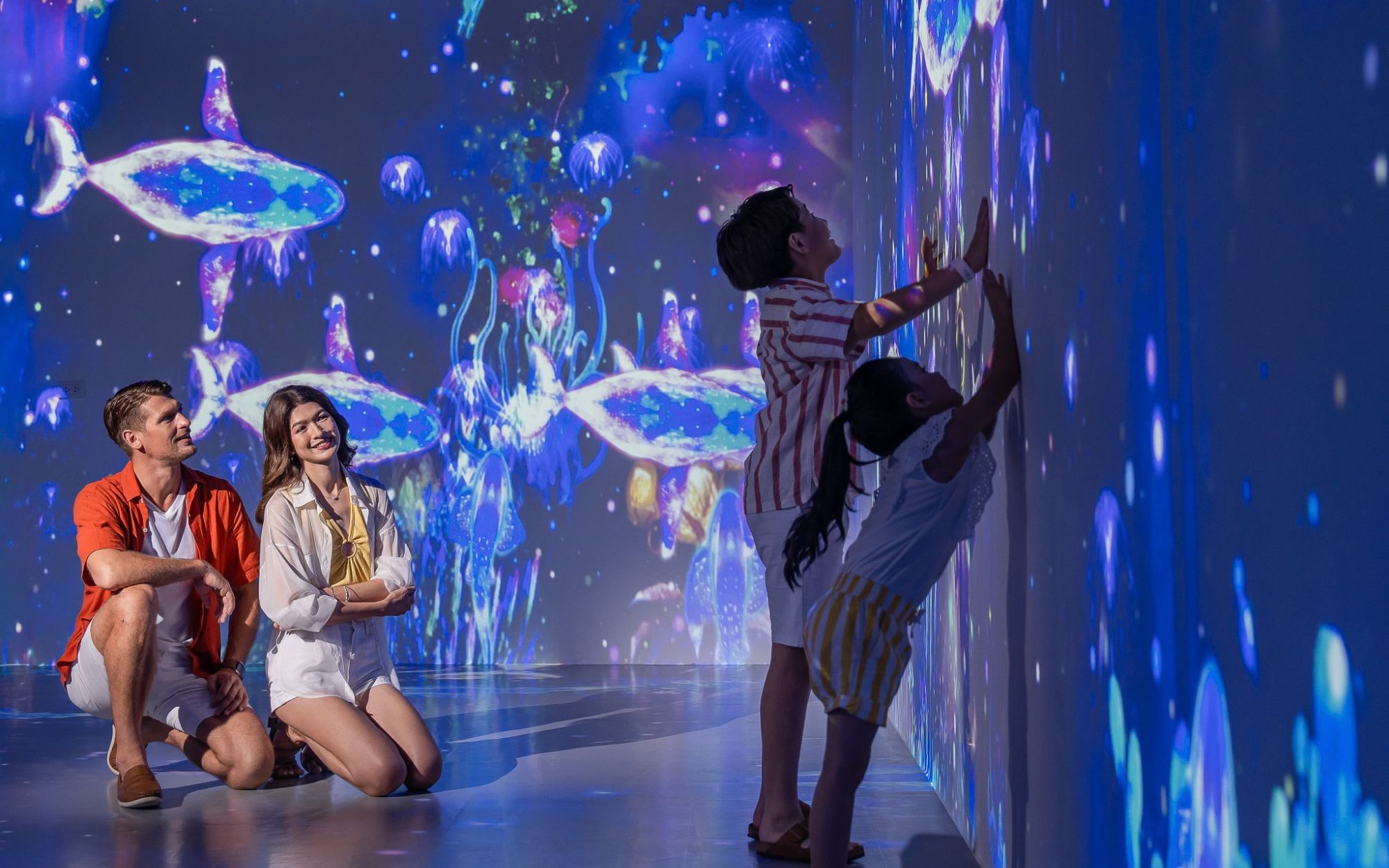 Touch, move, and explore as massive immersive digital walls transform around you from the depths of the Andaman Ocean to fantasy realms and futuristic landscapes.